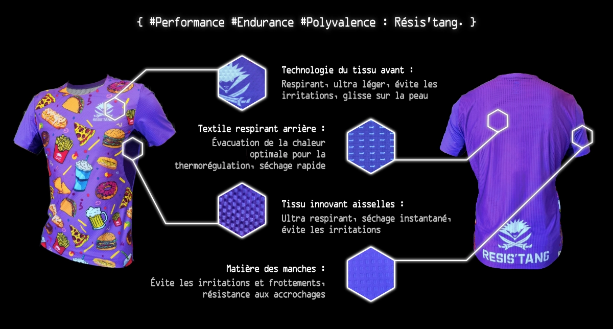 Le t-shirt Métabolik est pensé pour une performance optimale et un confort durable sur les ultra-trails. Son design inspiré de la street food de La Réunion et du monde, apporte une touche originale et dynamique à vos sorties. On reconnaitra le fameux gratiné bouchons et les samoussas de l’île intense. Moins de coutures là où ça compte : fini les frottements, place au confort.